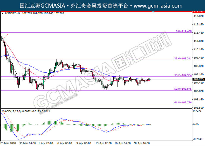 USDJPY,H4:美日震荡于压力位下方。由于MACD并没有显示任何明确信号,建议等到更多信号出现后再进入市场。上方关注107.95压力和109.30压力,下方关注106.85支撑和105.80撑。