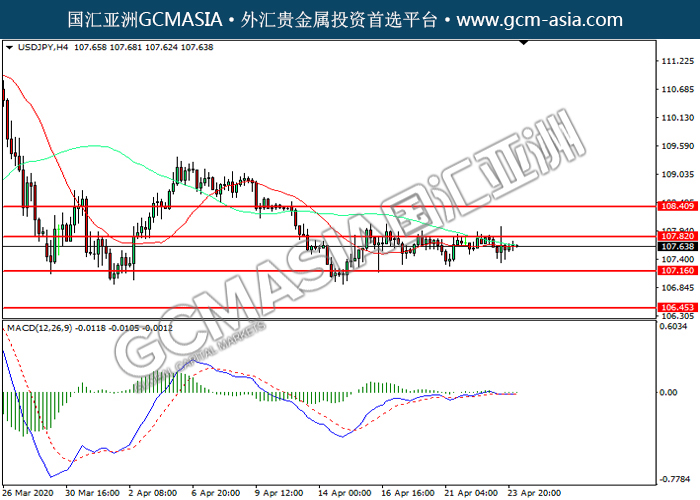 USDJPY,H4:美日震荡盘整,目前靠近前期压力。然而,MACD已形成死叉,动能转弱,短期可关注空头为主。上方关注107.80压力和108.40压力,下方关注107.15支撑和106.45支撑。