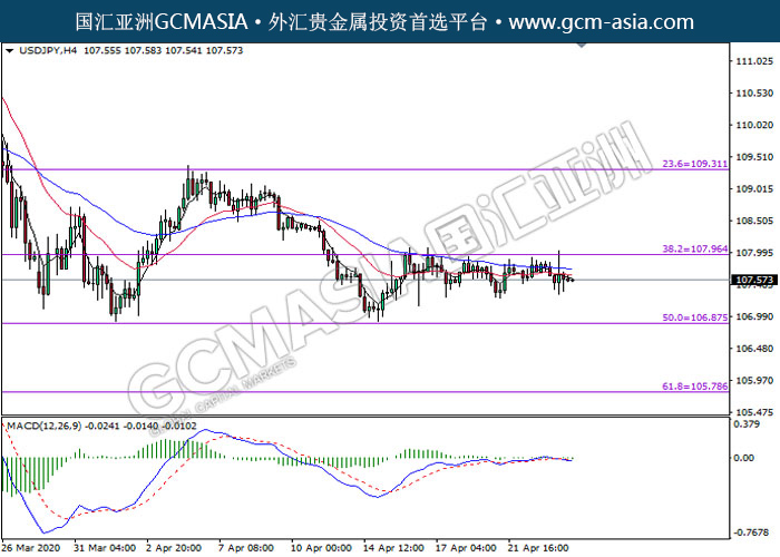 20200424 USDJPY by willy | Apr 24, 2020 | 美元兑日元 | 0 comments GCMAsia - USDJPY USDJPY 2020-04-24 USDJPY,H4:美日高位承压后回落。MACD显示空头动能偏强,短期可关注空头为主。上方关注107.95压力和109.30压力,下方关注106.85支撑和105.80撑。