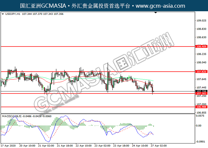USDJPY,H1:美日触及20均线(红)后回落。MACD显示空头动能偏强,短期可关注空头为主。上方关注107.80压力和108.40压力,下方关注107.30支撑和107.00支撑。