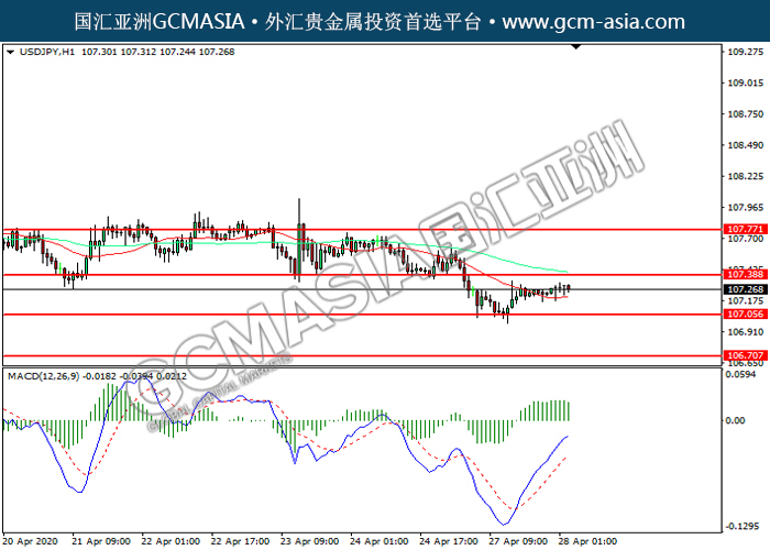USDJPY,H1:美日震荡盘整,目前靠近前期压力。MACD多头动能略减,短期可关注空头为主。上方关注107.40压力和107.75压力,下方关注107.05支撑和106.70支撑。