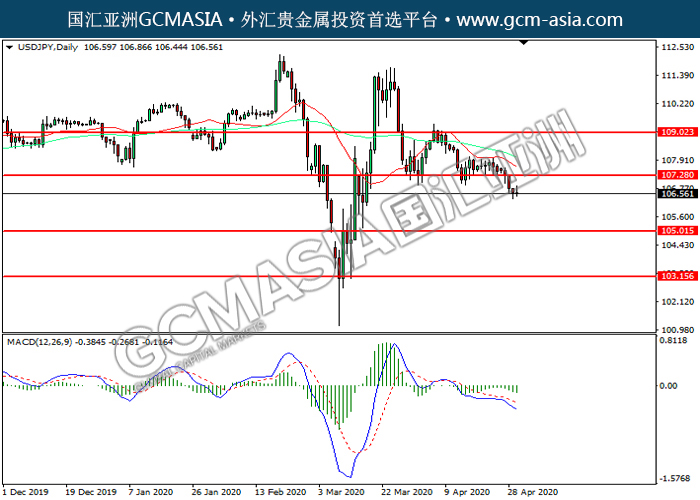 USDJPY,Daily:美日突破前期支撑,震荡下行。MACD空头动能略增,中期继续看空为主。上方关注107.30压力和109.00压力,下方关注105.00支撑和103.15支撑。
