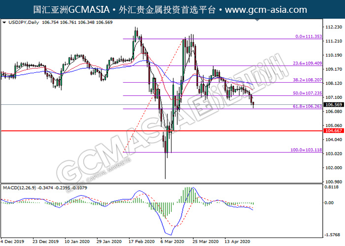USDJPY,Daily:美日突破后持续下行。MACD显示空头信号,中期可关注空头为主。上方关注107.25压力和108.20压力,下方关注106.25支撑和104.65撑。