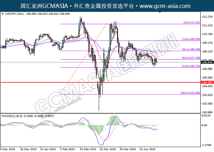 USDJPY,H4:美日高位承压后回落。MACD显示空头信号,短期可关注空头为主。上方关注107.20压力和108.20压力,下方关注106.25支撑和104.50撑。