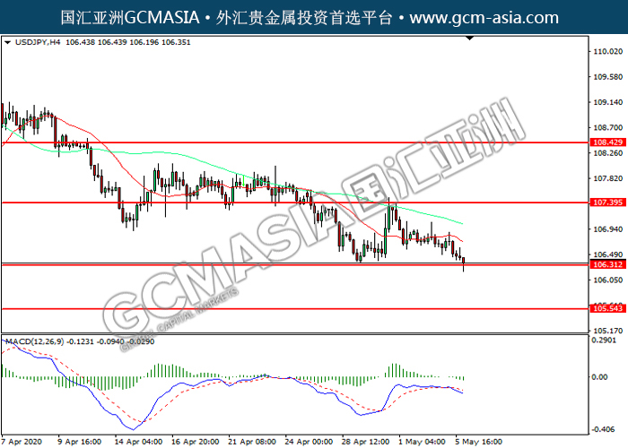 USDJPY,H4:美日震荡下行,目前测试前期支撑。MACD空头动能略增,若下破可关注空头为主。上方关注107.40压力和108.45压力,下方关注106.30支撑和105.55支撑。