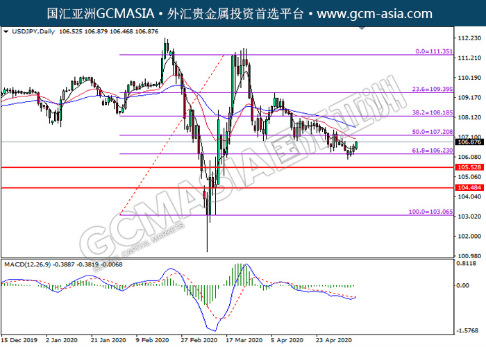 20200511 USDJPY by willy | May 10, 2020 | 美元兑日元 | 0 comments GCMAsia - USDJPY USDJPY 2020-05-11 USDJPY,Daily:美日地位反弹。MACD显示多头信号,中期可关注多头为主。上方关注107.20压力和108.20压力,下方关注106.25支撑和104.50撑。