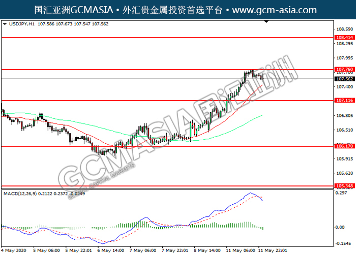 20200512 USDJPY by willy | May 12, 2020 | 美元兑日元 | 0 comments GCMAsia-USDJPY USDJPY 2020-05-12 USDJPY,H1:美日震荡下行。MACD空头动能略增,短期可关注空头为主。上方关注107.75压力和108.40压力,下方关注107.10支撑和106.15撑。