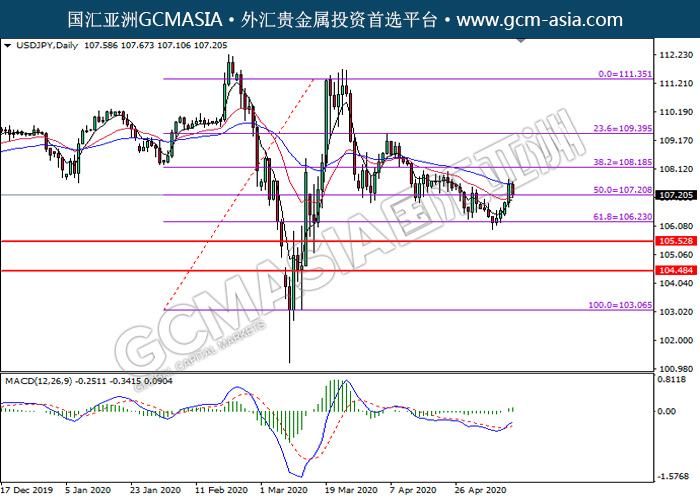 USDJPY,Daily:美日触及50均线(蓝色)后回调。然而,MACD显示多头信号,短期可关注多头反弹为主。上方关注108.20压力和109.40压力,下方关注107.20支撑和106.25撑。