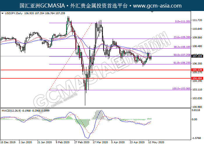 USDJPY,Daily:美日地位反弹,目前测试着压力位。MACD显示多头信号,动能略增,若突破可关注多头为主。上方关注107.20压力和108.20压力,下方关注106.25支撑和105.55支撑。
