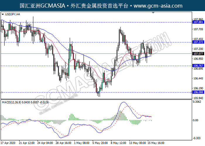 USDJPY, H4: 美日高位承压回落。 MACD显示空头,动能略减,短期继续看空回调为主。上方关注107.35压力和107.90压力,下方关注106.75支撑和106.10支撑。