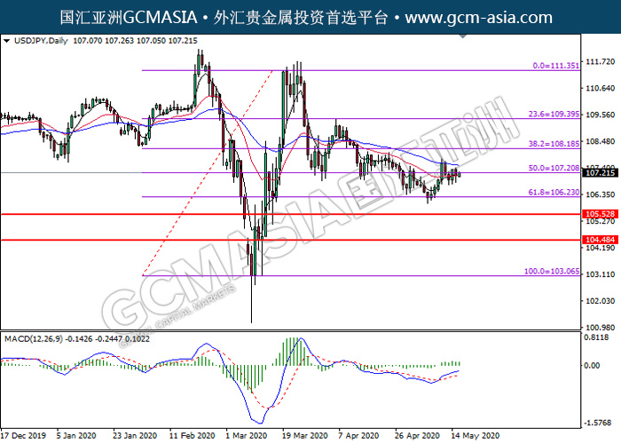 USDJPY,Daily:美日高位承压后回落。MACD显示空头信号,动能略减,中期可关注空头为主。上方关注107.20压力和108.20压力,下方关注106.25支撑和105.55支撑。