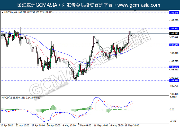 USDJPY,H4:美日多头排列,目前测试靠近前期压力。然而,MACD多头动能有所略减,短期关注技术性空头回调趋势为主。上方关注107.95压力和108.55压力,下方关注107.35支撑和106.50支撑。