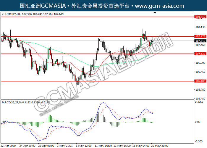 20200521 USDJPY-午间 by keyk | May 21, 2020 | 美元兑日元 | 0 comments GCMAsia - USDJPY USDJPY 2020-05-21 USDJPY,H4:美日震荡下行。MACD空头动能有所略增,短期可持续关注空头为主。上方关注107.80压力和108.50压力,下方关注107.10支撑和106.10支撑。