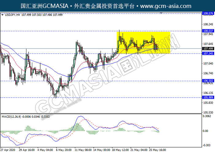 USDJPY,H4:美日区间震荡,目前测试靠近前期支撑。然而,MACD动能略减,若突破关注空头趋势为主。上方关注108.05压力和108.55压力,下方关注107.35支撑和106.50支撑。