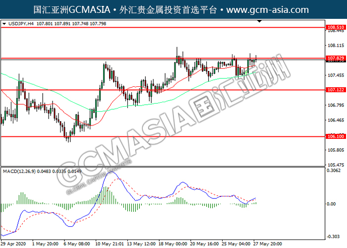 USDJPY,H4:美日震荡盘整,目前测试前期压力。MACD已形成金叉,动能转强,若突破关注多头为主。上方关注107.85压力和108.50压力,下方关注107.10支撑和106.10支撑。