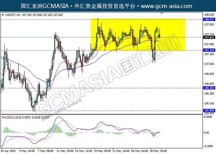 USDJPY,H4:美日仍区间震荡。由于MACD缺乏明确方向,建议等更清晰的信号出现如突破才进入市场。上方关注108.05压力和108.55压力,下方关注107.35支撑和106.50支撑。