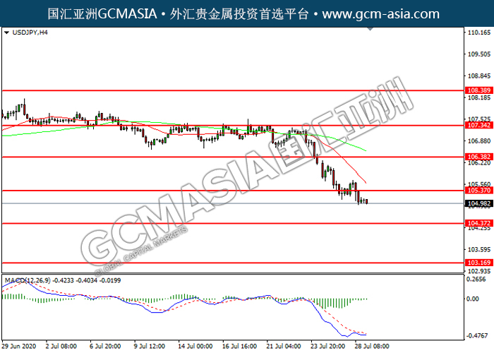 USDJPY,H4:美日突破前期支撑,震荡下行。然而,MACD空头动能略减,短期可技术性回调为主。上方关注105.35压力和106.40压力,下方关注104.35支撑和103.15支撑。