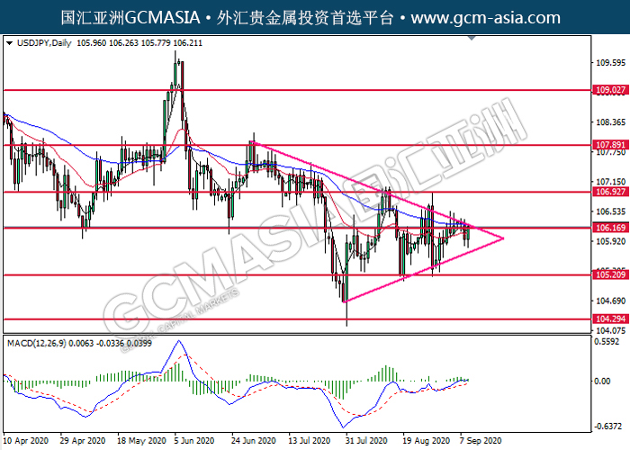 USDJPY,Daily:美日震荡上行,目前测试着三角趋势顶部。MACD显示多头信号,动能偏强,若突破可关注多头趋势为主。上方关注106.15压力和106.95压力,下方关注105.20支撑和104.30支撑。