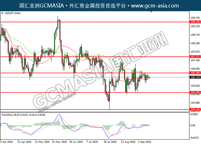 USDJPY,Daily:美日震荡上行,目前测试前期压力。然而,MACD多头动能有所略减,短期关注技术性空头回调屋主。上方关注106.40压力和107.35压力,下方关注105.20支撑和104.15。