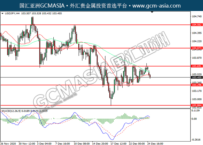 20201228 USDJPY by willy | Dec 28, 2020 | 美元兑日元 | 0 comments GCMAsia-USDJPY USDJPY 2020-12-28 USDJPY,H4:美日高位回落。MACD多头动能开始略减,短期可关注空头方向为主。上方关注103.70压力和104.05压力,下方关注103.30支撑和102.85支撑。
