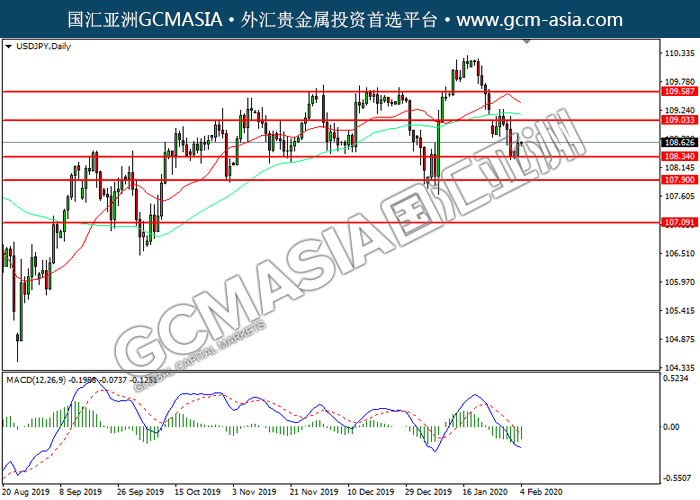 2020204 USDJPY by skylow | Feb 4, 2020 | 美元兑日元 | 0 comments GCMAsia - USDJPY USDJPY 2020-02-04 USDJPY,Daily:美日低位反弹。MACD空头动能略减,短期关注多头为主。上方关注109.05压力和109.60压力,下方关注108.35支撑和107.90支撑。