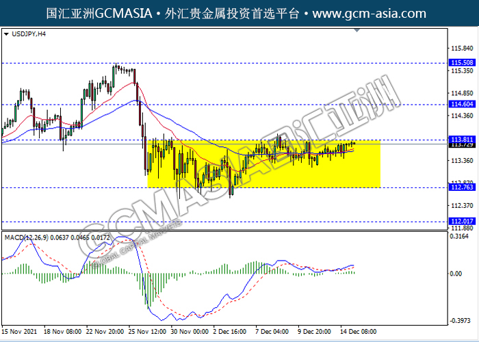 20211215 USDJPY-午间 by keyk | Dec 15, 2021 | 美元兑日元 | 0 comments USDJPY,H4:美日区间震荡盘整,目前测试前期压力。然而,MACD显示多头方,动能略增,若突破可继续看多为主。上方关注113.80压力和114.60压力,下方关注112.75支撑和112.00支撑。
