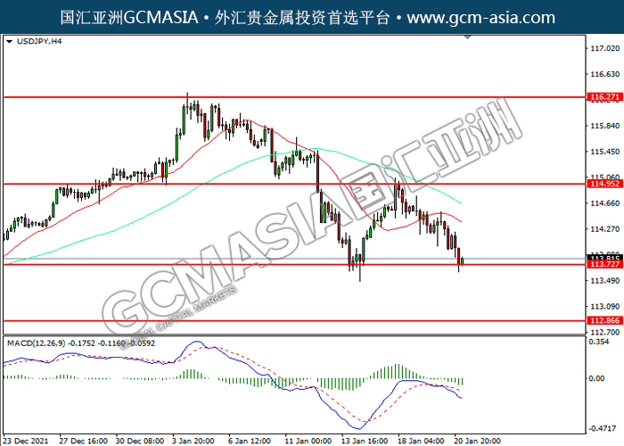 20220121 USDJPY-午间 by willy | Jan 21, 2022 | 美元兑日元 | 0 comments USDJPY,H4:美日震荡下行,目前测试前期支撑。MACD空头动能略增,若下破可关注空头为主。上方关注114.95压力和116.25压力,下方关注113.75支撑和112.85支撑。