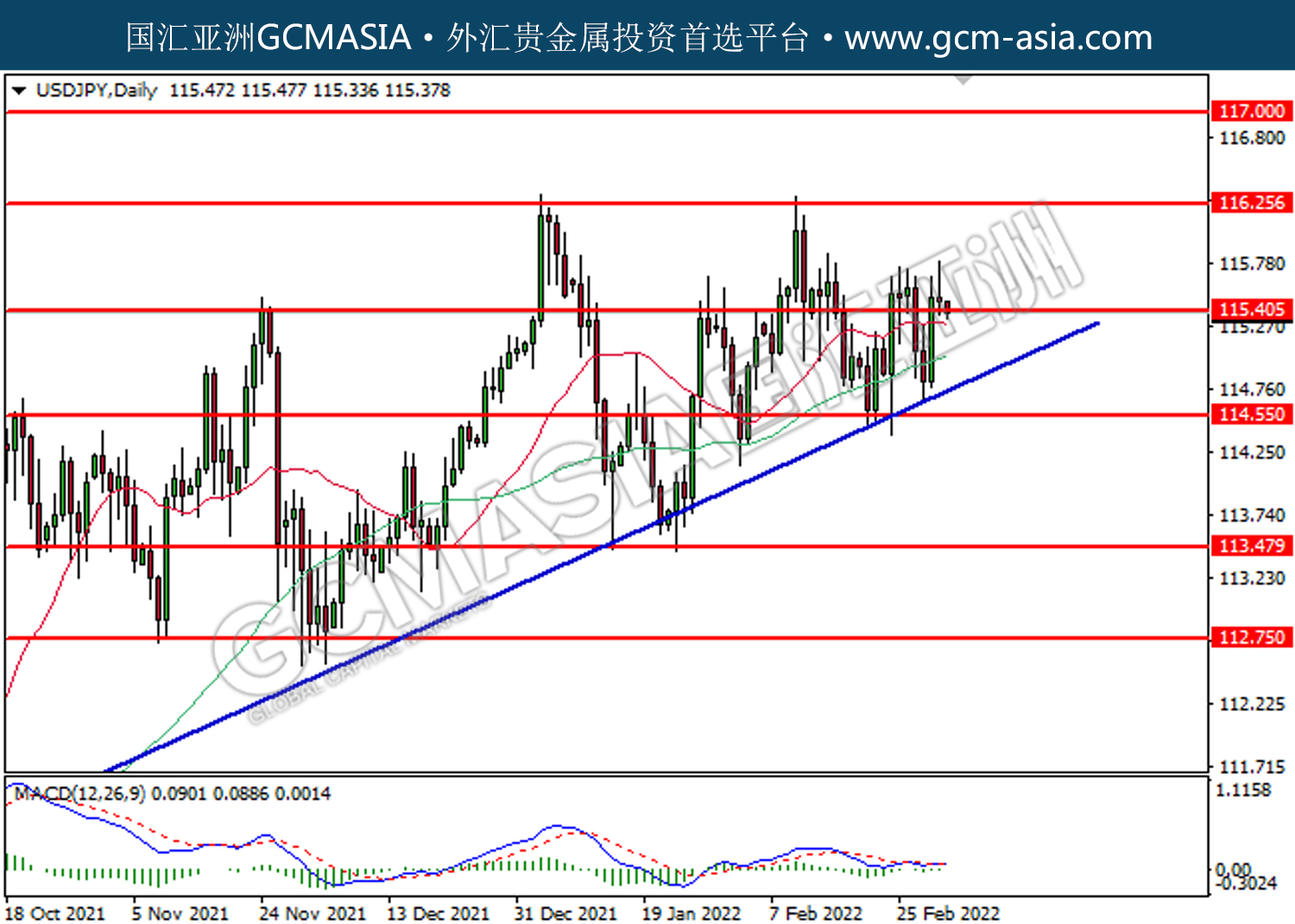 20220304 USDJPY by willy | Mar 4, 2022 | 美元兑日元 | 0 comments USDJPY,Daily:美日受承压回落。MACD多头动能有所略减,短期关注空头势力为主。上方关注116.25压力和117.00压力,下方关注115.40支撑和114.55支撑。