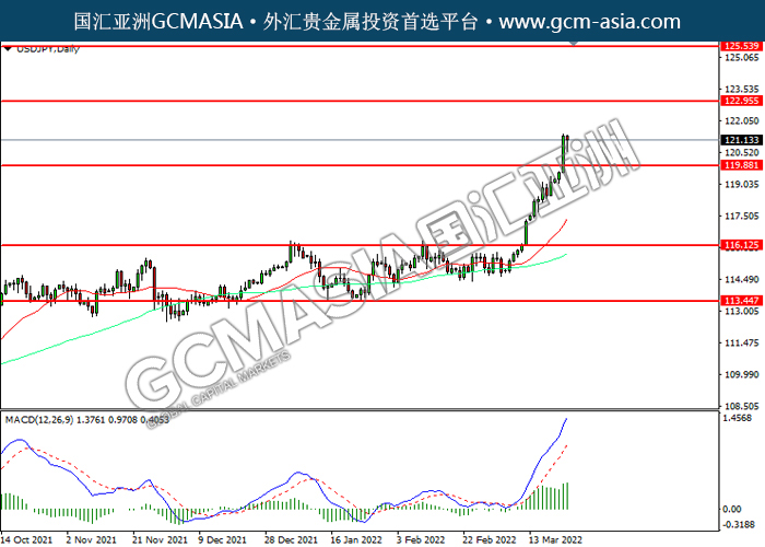 20220324 USDJPY by willy | Mar 24, 2022 | 美元兑日元 | 0 comments USDJPY,Daily:美日突破前期压力,震荡上行。MACD多头动能略增,短期可关注多头为主。方关注122.95压力和125.55压力,下方关注119.90支撑和116.15支撑。