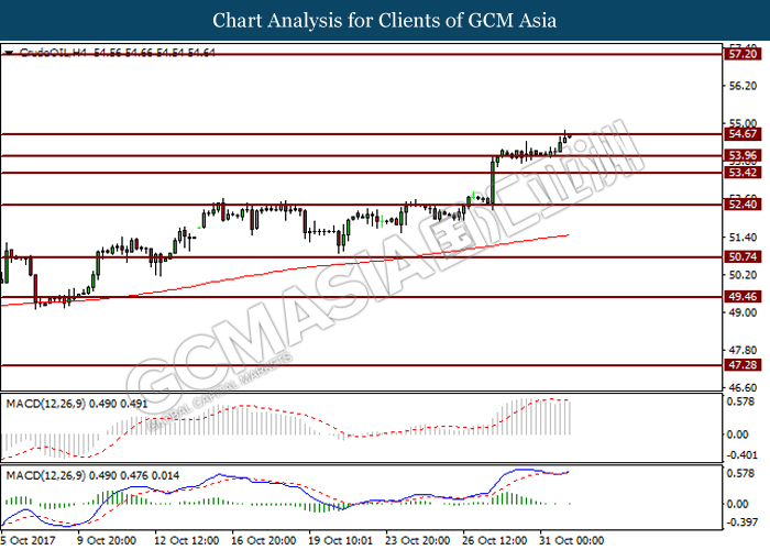 Crude OIL, H4: Crude oil price was traded higher prior breaking resistance level at 53.95. The commodity is currently testing the next resistance level at 54.65. Successful closure above the said resistance level would further indicates crude oil price to extend its momentum to trade higher toward the next resistance level at 57.20.
