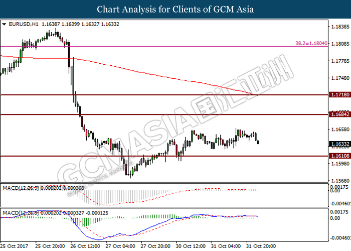 EURUSD, H1: EURUSD was traded higher after breaking resistance level at 1.1610. Absence of signal from both significant candlestick pattern and MACD histogram suggest to wait for breakout to occur to gain confirmation regarding the trend of the pair within short-term timeframe.