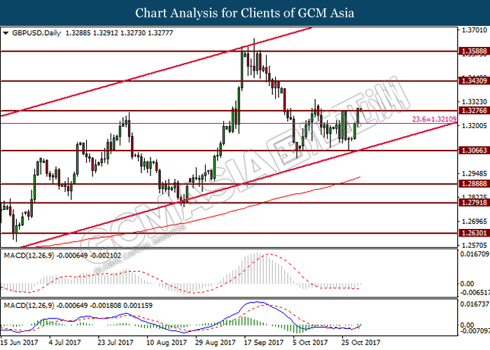 Dollar index edged higher by 0.07% against a trade-weighted basket of major currencies, last quoted to 94.51 after it is buoyed by better-than-expected manufacturing growth and consumer confidence data. U.S. economy remains supported as consumer confidence rose to its highest level since 2008 at 125.9 in October from 119.8 in September versus the forecast reading of 121.0. In addition, the Chicago Purchasing Managers’ Index (PMI) – a leading indicator of the U.S. economy rose to 66.2 versus the expected 61.0. However, the gains of Greenback remain capped despite the two positive economic data as investors are waiting further clues on monetary policy from the Fed and President Donald Trump’s choice of candidate to head the Fed in February. On the other hand, GBP/USD rose 0.60% to 1.3281 amid growing investors’ expectation toward the Bank of England (BoE) to hike interest rates for the first time in more than a decade on Thursday.