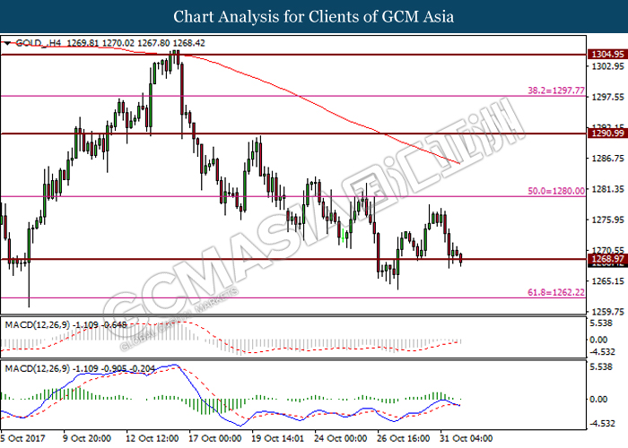 GOLD_, H4: Gold price was traded lower prior retracement from resistance level at 1280.00. It is currently testing the support level at 1268.95. Successful closure below the said support level would further suggest the commodity to extend its losses toward the next support level at 1262.20.
