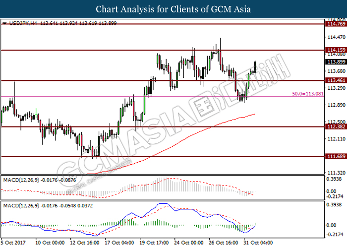 USDJPY, H4: USDJPY was traded higher after breaking resistance level at 113.45. Bullish candlesticks arrangement and golden-cross as formed by MACD signal line suggest the pair to extend its gains toward the next resistance level at 114.15.
