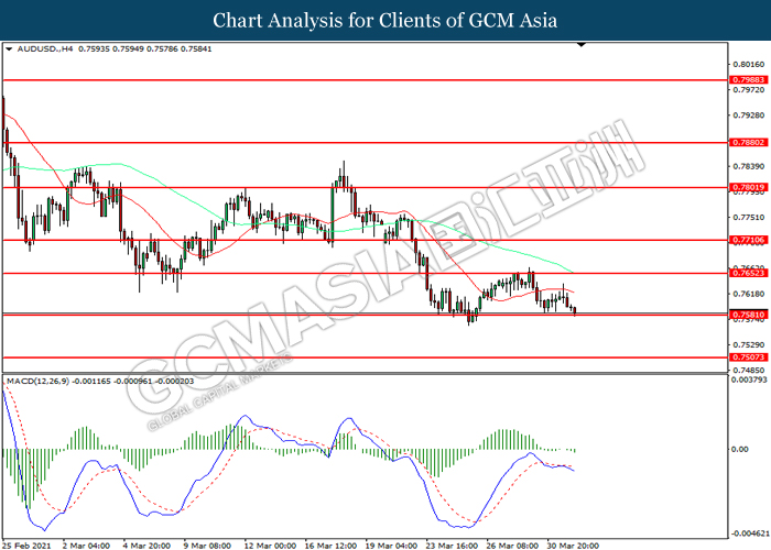 AUDUSD, H4: AUDUSD was traded lower while currently testing the support level at 0.7580. MACD which illustrated increasing bearish momentum suggest the pair to extend its losses after it successfully breakout below the support level.