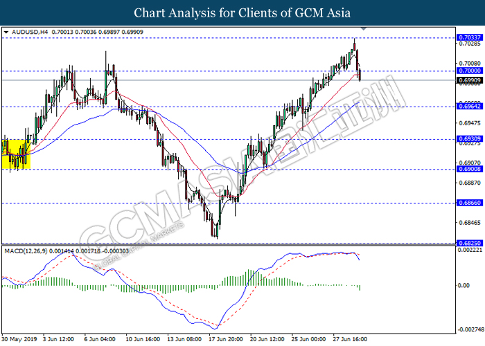 AUDUSD, H4: AUDUSD was traded lower following prior breakout below the support level 0.7000. MACD which illustrate bearish bias signal with the formation of death cross suggest the pair to extend its losses towards the support level 0.6965.