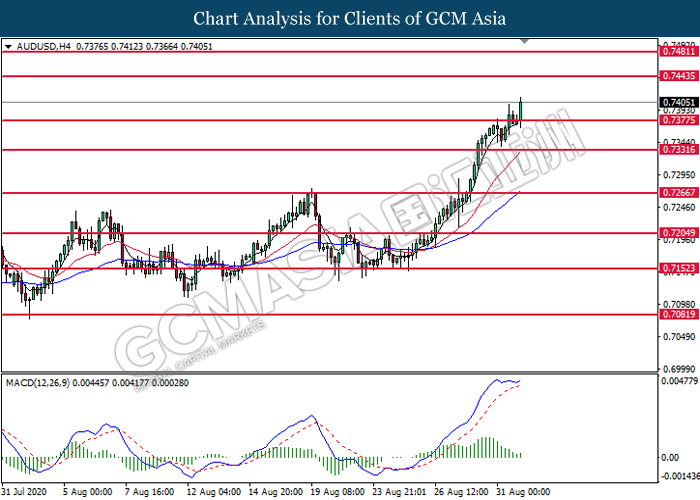 AUDUSD, H4: AUDUSD was traded higher following prior breakout above the previous resistance level at 0.7380. MACD which illustrated bullish bias momentum suggest the pair to be traded higher toward the resistance level at 0.7445.