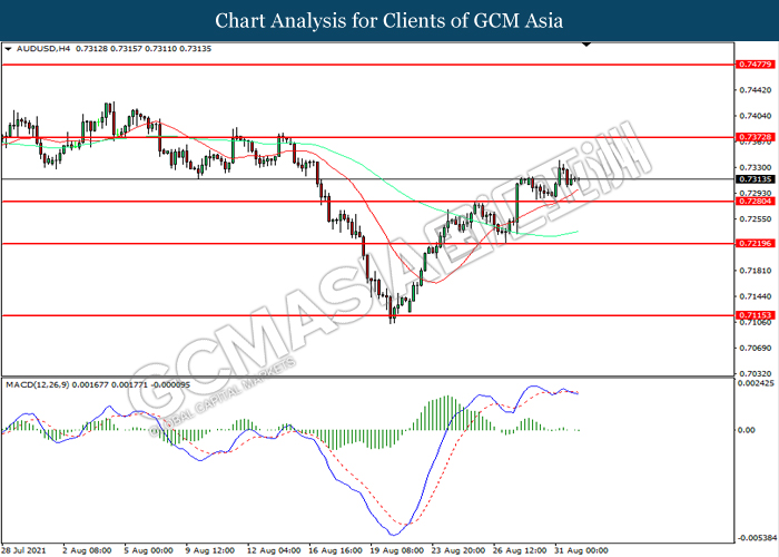 AUDUSD, H4: AUDUSD was traded higher following prior breakout above the previous resistance level at 0.7280. However, MACD which illustrated increasing bearish momentum suggest the pair to be traded lower in short-term as technical correction.
