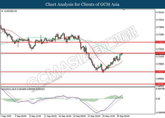 AUDUSD, H4: AUDUSD was traded higher while currently testing the resistance level at 0.7170. However, MACD which illustrated diminishing bullish momentum suggest the pair to be traded lower in short-term as technical correction.