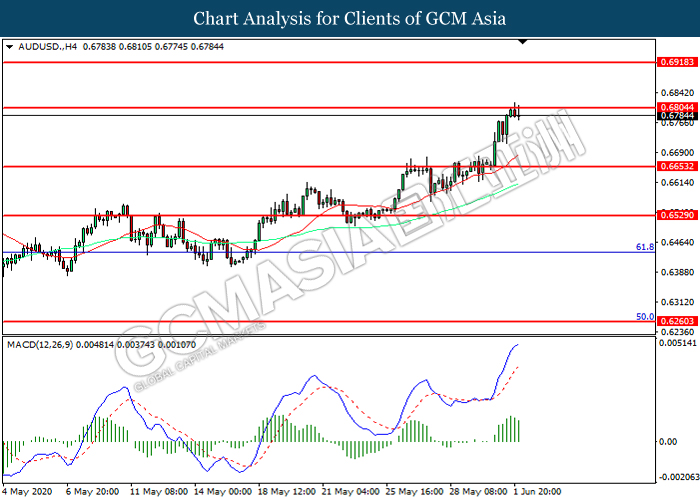 AUDUSD, H4: AUDUSD was traded higher while currently testing the resistance level at 0.6805. However, MACD which illustrated diminishing bullish momentum suggest the pair to be traded lower in short-term as technical correction.