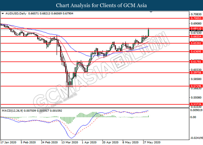 AUDUSD, Daily: AUDUSD was traded higher while currently testing the resistance level at 0.6810. MACD which illustrates bullish bias momentum signal suggest the pair to extend its gains after it successfully breakout above the resistance level at 0.6810.