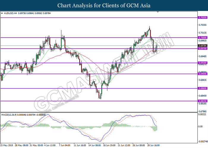 AUDUSD, H4: AUDUSD was traded higher while currently testing near the 20-MA line (green). MACD which illustrate bullish bias signal suggest the pair to be traded higher after successfully closing above the 20-MA line (green).
