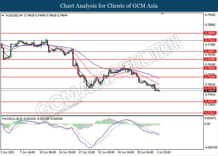 AUDUSD, H4: AUDUSD was traded flat while currently testing the resistance level 0.7475. However, MACD which illustrate diminishing bearish momentum signal suggest the pair to be traded higher as a technical correction after it breaks above the resistance level.