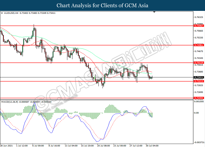 AUDUSD, H4: AUDUSD was traded lower while currently testing the support level at 0.7320. MACD which illustrated increasing bearish momentum suggest the pair to extend its losses after it successfully breakout below the support level.