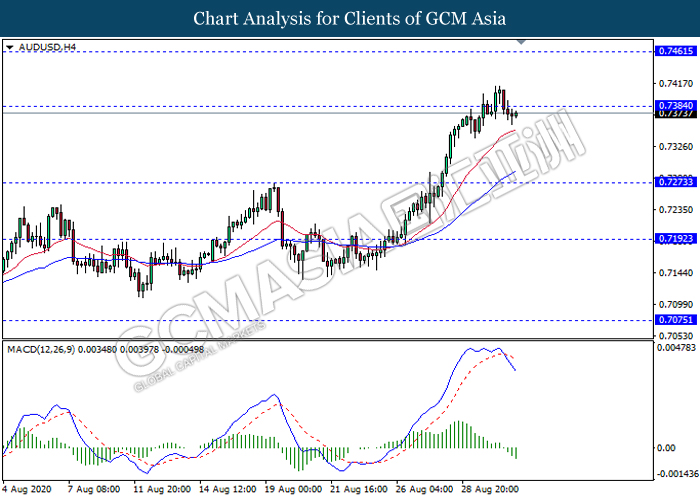 AUDUSD, H4: AUDUSD was traded higher while currently testing the resistance level 0.7385. However, MACD which illustrate bearish momentum signal with the formation of death cross suggest the pair to be traded lower as a technical correction towards the support level 0.7275.