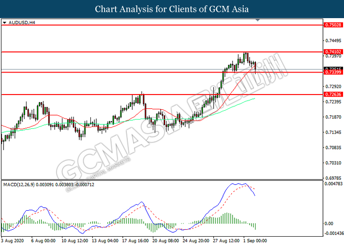AUDUSD, H4: AUDUSD was traded lower while currently testing the support level at 0.7340. MACD which illustrated increasing bearish momentum suggest the pair to extend its losses after it successfully breakout below the support level.