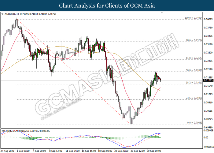 AUDUSD, H4: AUDUSD was traded lower while currently testing near 0.7160. MACD which illustrate diminished upward momentum suggests the pair to extend its losses after closing below 0.7160.