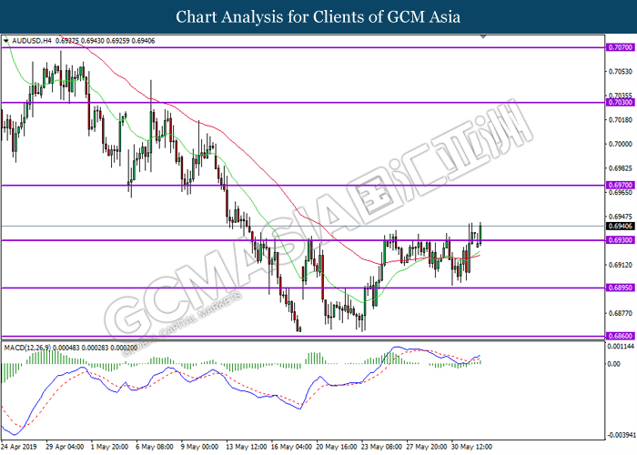 AUDUSD, H4: AUDUSD was traded higher following prior breakout previous resistance level 0.6930. MACD which display bullish momentum suggest the pair to extend its gains towards the resistance level 0.6970.