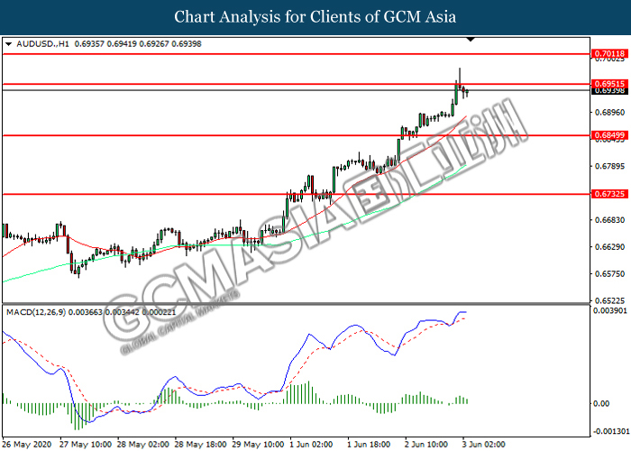 AUDUSD, H1: AUDUSD was traded higher while currently testing the resistance level at 0.6950. However, MACD which illustrated diminishing bullish momentum suggest the pair to be traded lower in short-term as technical correction.