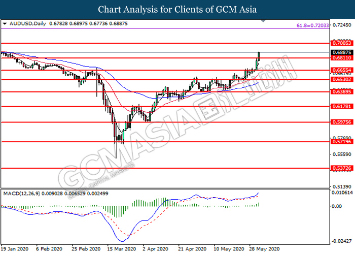 AUDUSD, Daily: AUDUSD was traded higher following prior breakout above the previous resistance level at 0.6810. MACD which illustrates bullish bias momentum signal suggest the pair to extend its gains toward the resistance level at 0.7005.